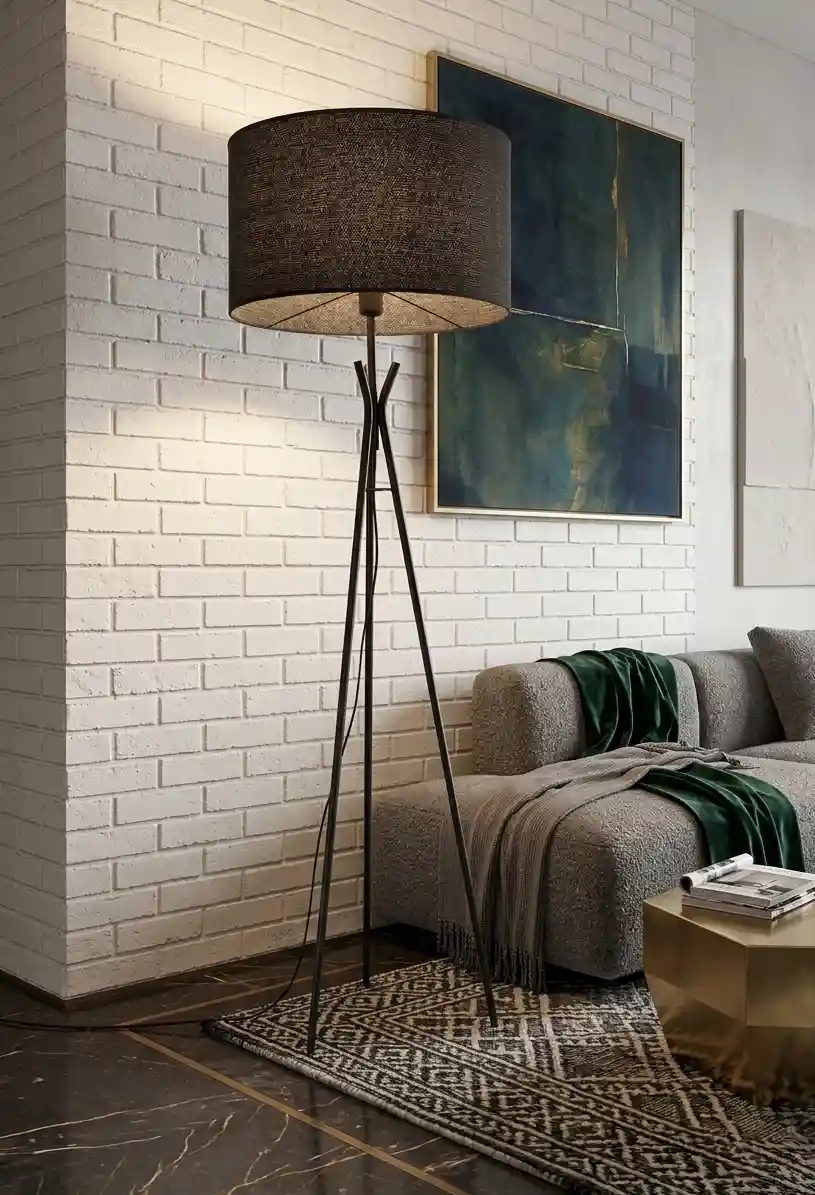 This tripod floor lamp adds a strong yet elegant statement to your décor. Its clean structure and black linen shade make it perfect beside sofas, armchairs, or in cozy corners, delivering soft and relaxing light that enhances the overall atmosphere.